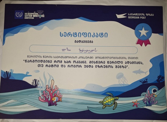 მათ შორის, IX კლასის მოსწავლე ლიზი წერეთელმა მონაწილეობა მიიღო საქართველოს ფოსტის მიერ გამოცხადებულ წერილების წერის საერთაშორისო კონკურსში, რომლის თემატიკაც ამჯერად ეკოლოგიას მიეძღვნა - „წარმოიდგინე, რომ ხარ ოკეანე, მისწერე წერილი ადამიანს, თუ რატომ ან როგორ უნდა იზრუნოს შენზე“.