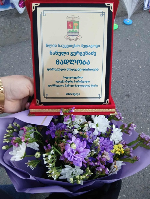 ახლახან, პედაგოგის ღვაწლი და შრომა საზეიმოდ აღინიშნა. ლანჩხუთის მუნიციპალიტეტის მერმა - ალექსანდრე სარიშვილმა პედაგოგს ღირსეული მოღვაწეობისთვის მადლობა გადაუხადა და წლის საუკეთესო პედაგოგის სიგელი გადასცა.