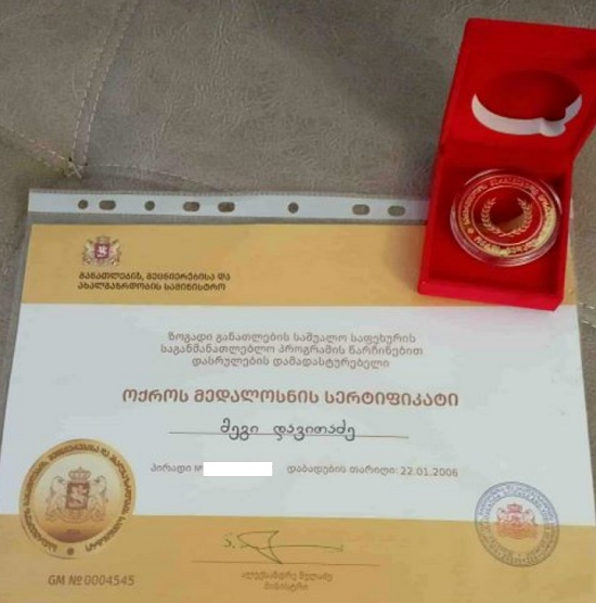 სკოლის კურსდამთავრებული ახლახან კუთვნილი მედლით დაჯილდოვდა.