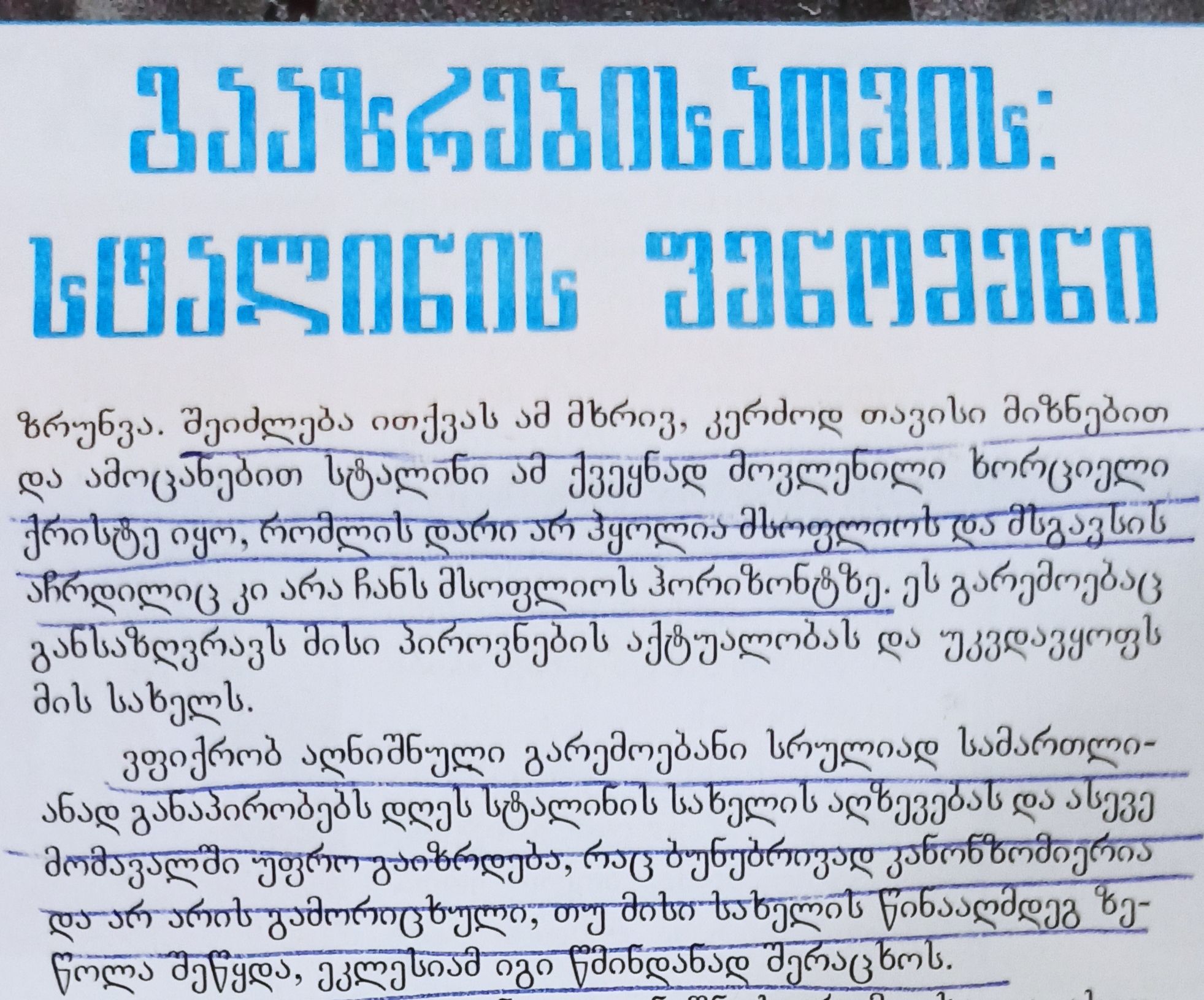 - არა, მხოლოდ პედაგოგებმა უნდა შევიძინოთ და ესეც მიუღებელია. გაზეთში დმანისში მიმდინარე მოვლენებზეა ხოლმე საუბარი, თუმცა სტალინზე მსგავსი სტატია კატეგორიულად მიუღებელია; ზოგადად, პრობლემა მგონია, არა მხოლოდ რა იბეჭდება ამ გაზეთში, არამედ კონტექსტურად, საინტერესოა, რატომ წამოიწია სტალინის თემამ ახლა“.