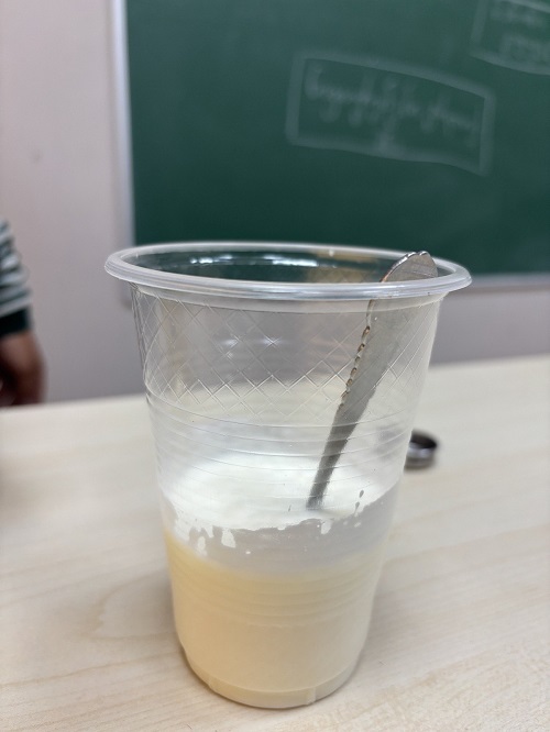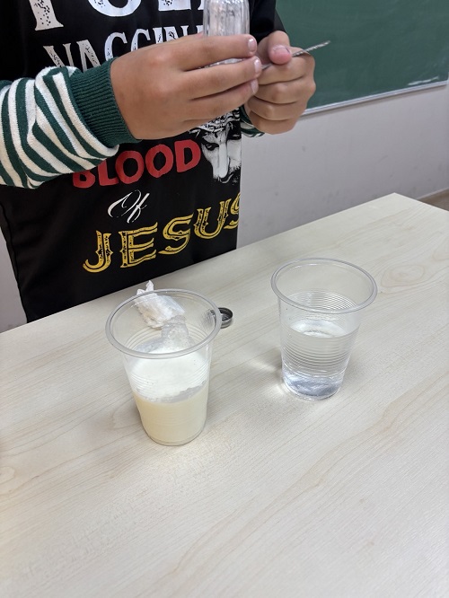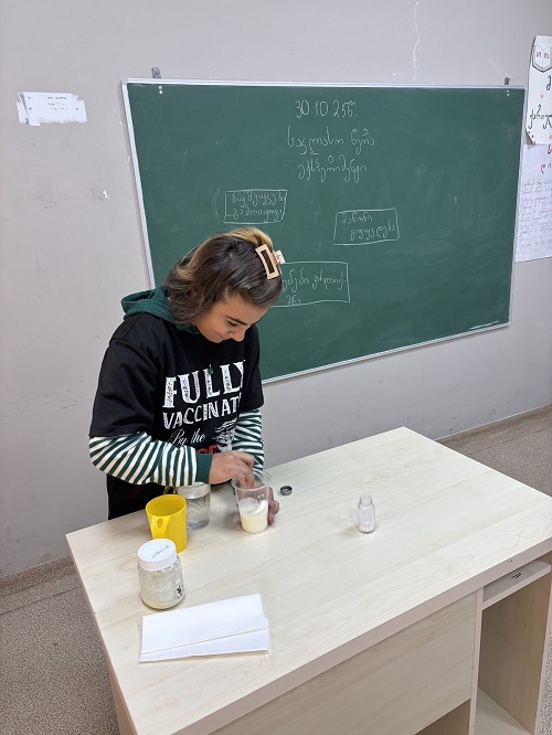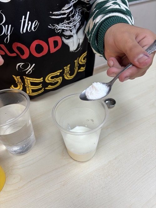 ექსპერიმენტის დროს გამოყენებული იყო მაწონი და სოდა. მოსწავლეებმა მაწონში ჩაყარეს ცოტა სოდა და შენიშნეს, რომ ნარევი აფუვდა და გამოჩნდა პატარა ბუშტები.