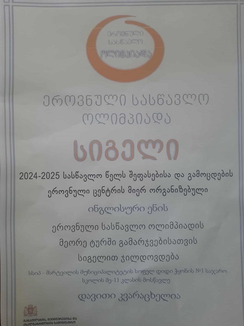 ახლახან, სკოლის მე-11 კლასის მოსწავლე დავით კვარაცხელია ეროვნული სასწავლო ოლიმპიადის მე-2 ტურში გამარჯვებისთვის დაჯილდოვდა.