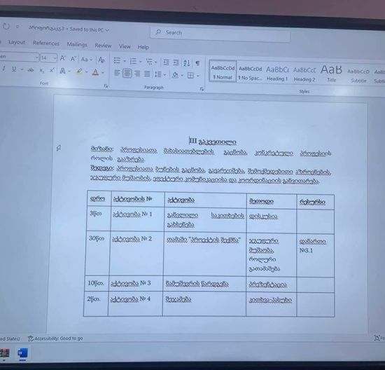 გაკვეთილი დატვირთული იყო მრავალფეროვანი აქტივობებითა და მეთოდებით: პროექტის შექმნა, პრეზენტაცია, ფილმის ჩვენება.