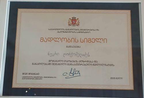 სკოლის მუსიკის მასწავლებელი მომავალი თაობის აღზრდასა და განათლების განვითარებაში შეტანილი განსაკუთრებული წვლილისთვის საქართველოს განათლების, მეცნიერებისა და ახალგაზრდობის სამინისტრომ მადლობის სიგელით დააჯილდოვა.