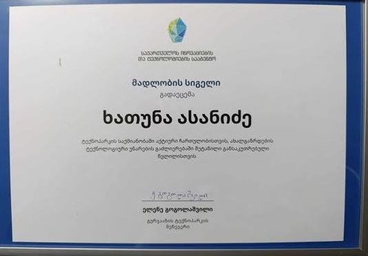 ასევე, დიდი მადლობა გადაუხადა სკოლის დირექტორმა კომპიუტერული ტექნოლოგიების პედაგოგს - ხათუნი ასანიძეს, რომელიც არის ამავე STEAM კლუბის მენტორი მასწავლებელი. იგი დაჯილდოვდა მადლობის სიგელით ტექნოპარკის საქმიანობაში აქტიური მონაწილეობისა და ახალგაზრდების ტექნოლოგიური უნარების განვითარებაში შეტანილი წვლილისთვის.