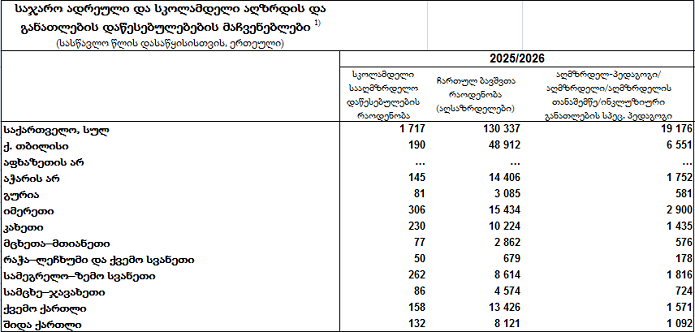 2025-2026 სასწავლო წლისთვის საქართველოში 1717 ბაღი, 19200-მდე აღმზრდელ-პედაგოგი/აღმზრდელი/აღმზრდელის თანაშემწე/ინკლუზიური განათლების სპეც. პედაგოგი და 130 ათასზე მეტი აღსაზრდელი ფიქსირდება.
