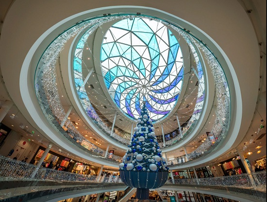 სავაჭრო ცენტრ - Beaugrenelle-ში შუშის გუმბათის ქვეშ სამკაულივით ჩამოკინწიალებული ნაძვის ხე ჰკიდია - ტრადიციული საახალწლო ნაძვის ხისგან სრულიად განსხვავებული, მაგრამ საოცრად ლამაზი და ეფექტური.