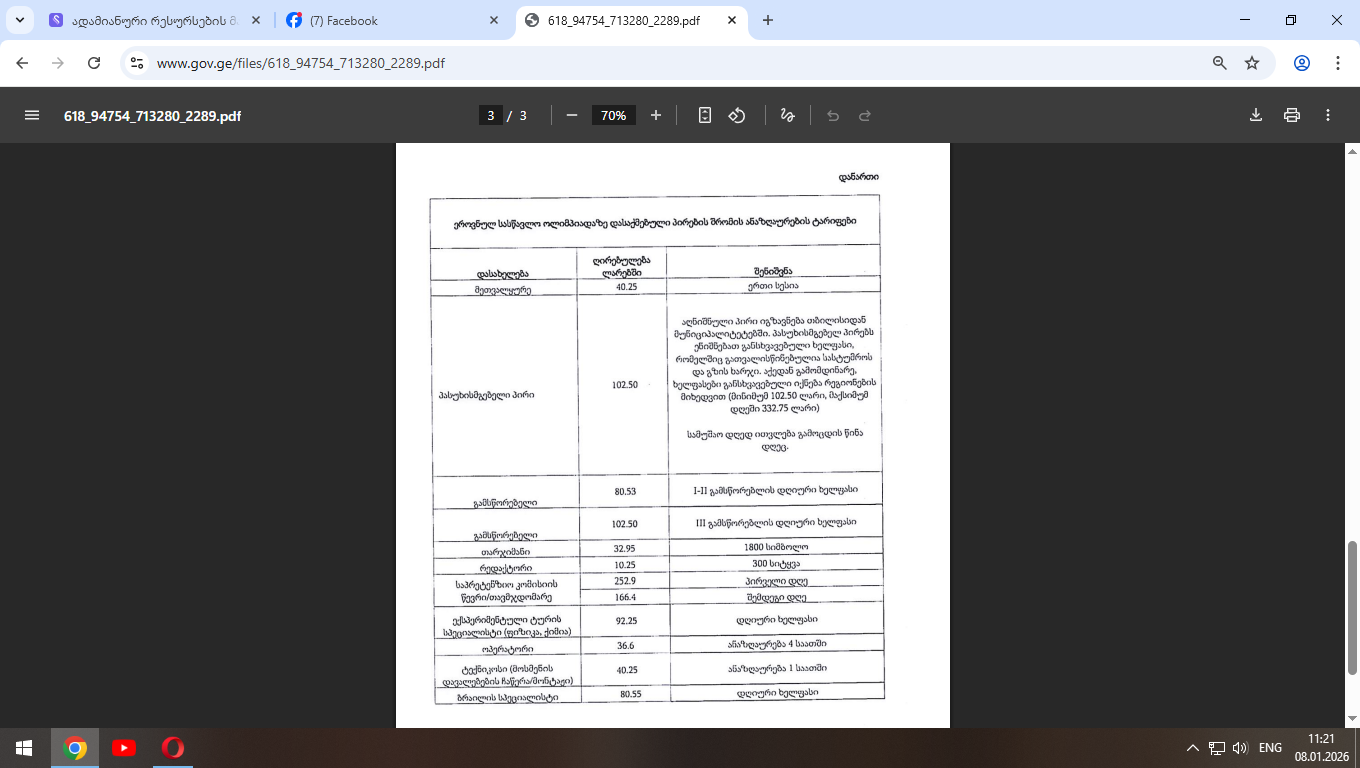 განკარგულება ძალაშია 1-ელი იანვრიდან და ეხება ეროვნულ სასწავლო ოლიმპიადაზე დასაქმებული პირების შრომის ანაზღაურების ტარიფებს: