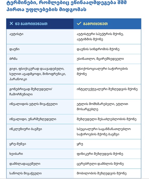 სპეციალისტები აღნიშნავენ, რომ „შეზღუდული შესაძლებლობის მქონე პირთა მიმართ გამოყენებული ტერმინები განსაზღვრავს პერსპექტივას, თუ როგორ განიხილება შეზღუდული შესაძლებლობა. ხშირად გაუცნობიერებლად და წლების განმავლობაში დამკვიდრებული არასწორი ტერმინებით ვაქრობთ შესაძლებლობას, შშმ პირები აღვიქვათ თანასწორუფლებიან მოქალაქეებად“... ამიტომ მათზე საუბრისას, მნიშვნელოვანია, რა სიტყვებს ვიყენებთ. ზოგი ტერმინი პატივისცემას გამოხატავს და თანასწორ დამოკიდებულებას აძლიერებს, ზოგი კი შეიძლება შეურაცხმყოფელი ან დამამცირებელი იყოს, თუნდაც უნებლიეთ.