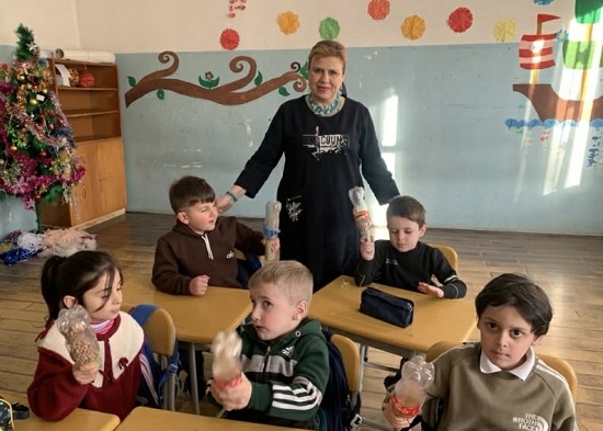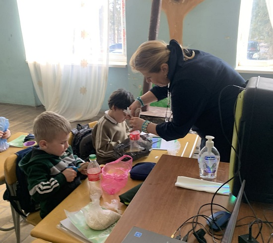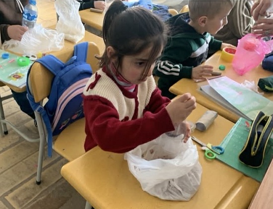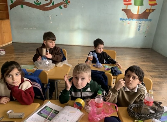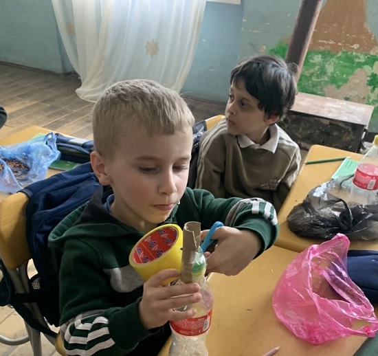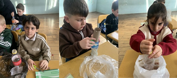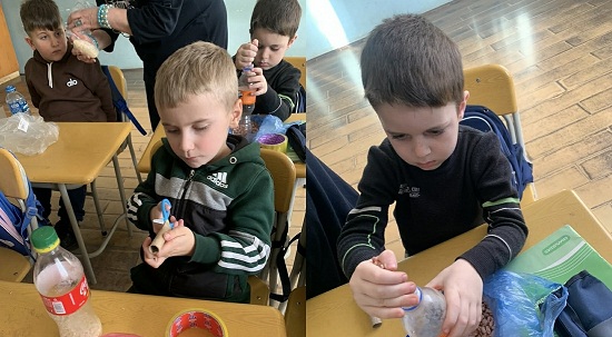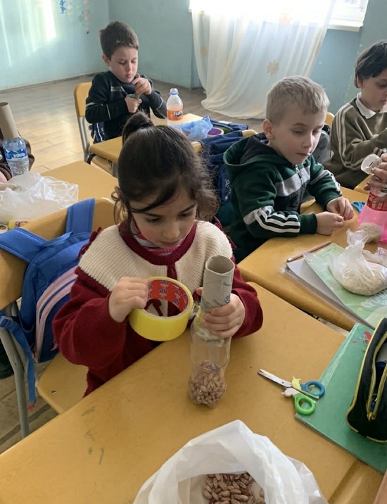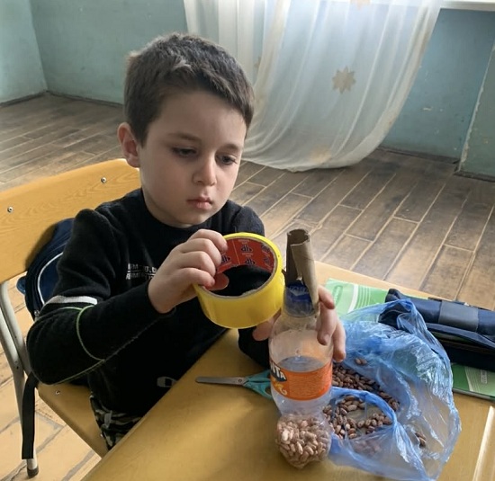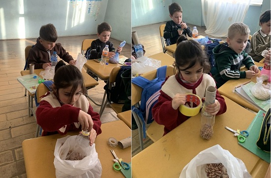 მოსწავლეებმა უყურეს ვიდეოს, სადაც ნაჩვენები იყო,თუ როგორ ამზადებენ ფერად-ფერად ჟღარუნებს, პოლიეთილენის ბოთლებით, ლობიოსა და ბრინჯის მარცვლებისგან.