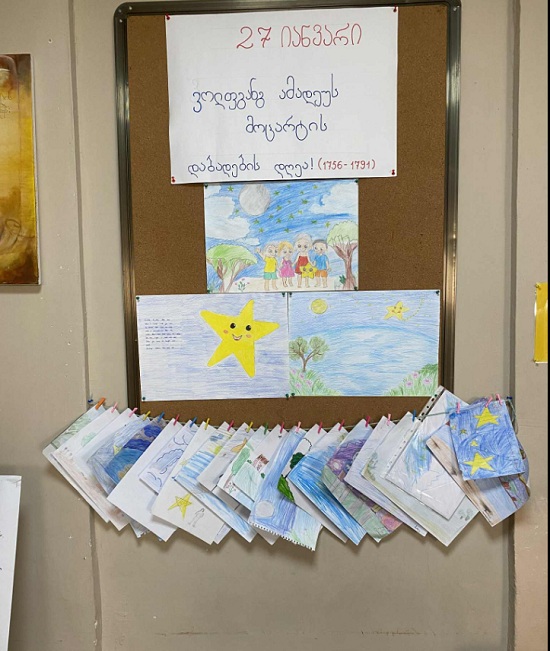 მოსწავლეებმა წარმოადგინეს პრეზენტაციები მოცარტის ბავშვობის, ოჯახის, მისი პირველი მუსიკალური ნაწარმოების შესახებ; მოუსმინეს და შეისწავლეს სიმღერა „Twinkle, Twinkle Little star”. მიღებული შთაბეჭდილებები გადმოსცეს ნახატებითა და სხვადასხვა ნამუშევრებით, რომელიც გამოფენილია სკოლის საგამოფენო სივრცეში.