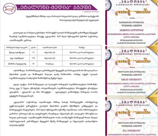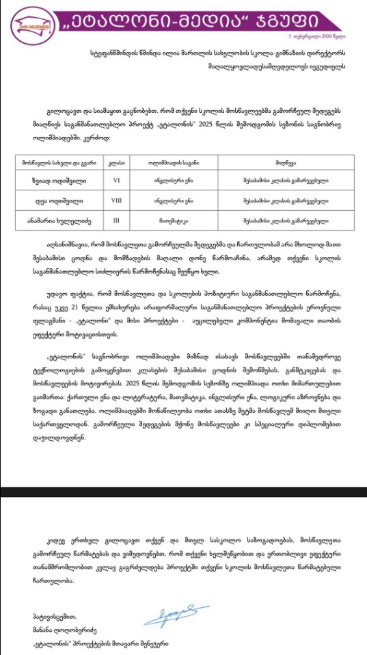 „გილოცავთ და სიამაყით გაცნობებთ, რომ თქვენი სკოლის მოსწავლეებმა გამორჩეულ შედეგებს მიაღწიეს საგანმანათლებლო პროექტ „ეტალონის“ 2025 წლის შემოდგომის სეზონის საგნობრივ ოლიმპიადებში.