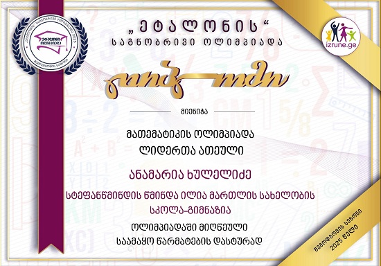მათემატიკის ოლიმპიადაში, კი საქართველოს მასშტაბით, შესაბამისი კლასის საუკეთესო შედეგების მქონე მოსწავლეთა ათეულშია ანამარია ხულელიძე.