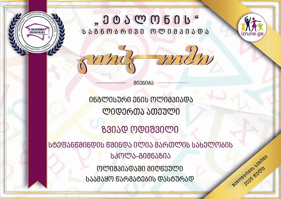 მე-6 კლასელი ზვიად ოდიშვილი ინგლისური ენის ოლიმპიადაში, საქართველოს მასშტაბით, შესაბამისი კლასის გამარჯვებულთა ათეულში მოხვდა.