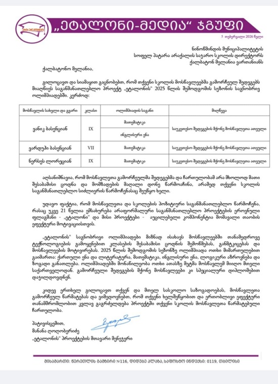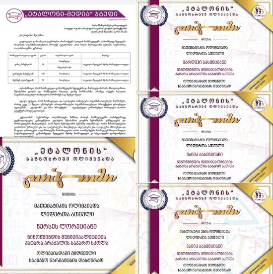 „გილოცავთ და სიამაყით გაცნობებთ, რომ თქვენი სკოლის მოსწავლეებმა გამორჩეულ შედეგებს მიაღწიეს საგანმანათლებლო პროექტ „ეტალონის“ 2025 წლის შემოდგომის სეზონის საგნობრივ ოლიმპიადებში.