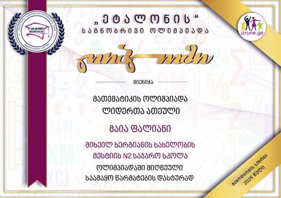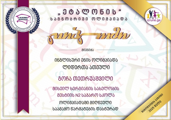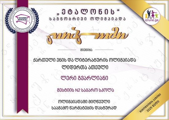მიხეილ ხერგიანის სახელობის დაბა მესტიის N2 საჯარო სკოლის მოსწავლეები - ანასტასია კახბერიძე, მაია ფალიანი, გოჩა თეთრუაშვილი და ლერი გვარლიანი „ეტალონის“ საგნობრივი ოლიმპიადის გამორჩეული წევრები არიან.