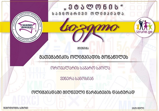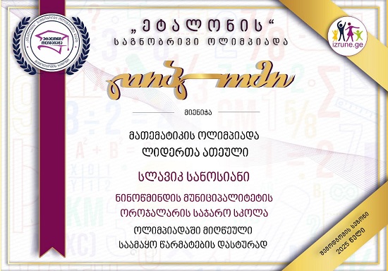 სლავიკ სანოსიანმა, ვარდუჰი ელოიანმა, რიმა თაზაიანმა, ჰაიკანუშ თაზაიანმა, ტატიანა ნორსოიანმა, სლავიკ სანოსიანმა და ვენერა სანოსიანმა ცოდნა და შესაძლებლობები წარმოაჩინეს და წარმატების დასტურად სიგელები დაიმსახურეს. ამასთან, სლავიკ სანოსიანმა, ვარდუჰი ელოიანმა და სლავიკ სანოსიანმა დიპლომები მოიპოვეს ოლიმპიადაში მიღწეული საამაყო შედეგებისთვის. სლავიკ სანოსიანი მათემატიკის ოლიმპიადის შესაბამისი კლასის, ლიდერთა ათეულშია.