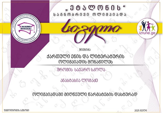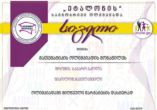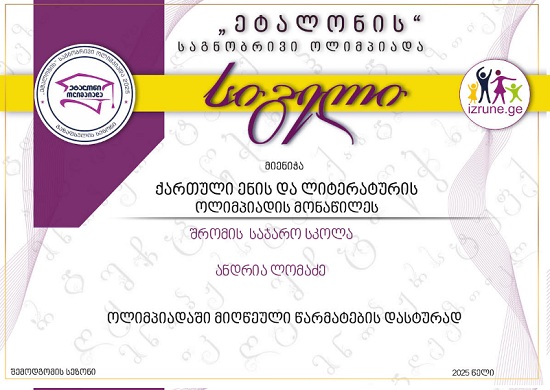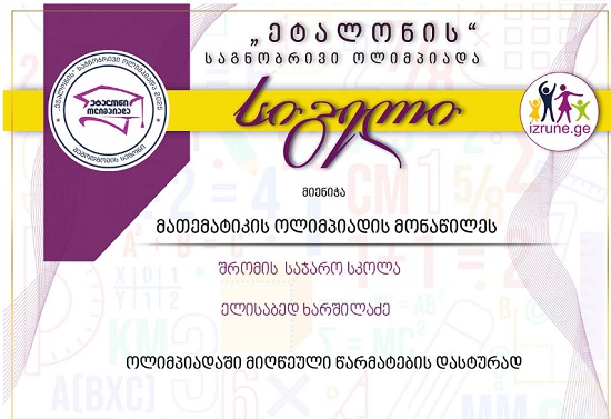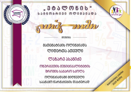 ლაზარე მათემატიკის ოლიმპიადის, საქართველოს მასშტაბით, შესაბამისი კლასის, ლიდერთა ათეულშია.