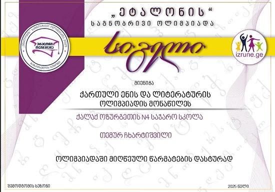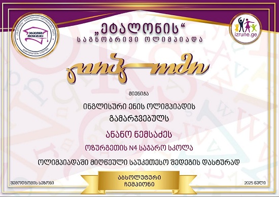 ანანო ნემსაძემ, ბარბარე ტუღუშმა, ლიზი მიქატაძემ, მარიამი დუმბაძემ, მარიამ ჩხაიძემ, ანა კვაჭანტირაძემ და თემურ ჩხარტიშვილმა ოლიმპიადაში ცოდნა და შესაძლებლობები წარმოაჩინეს და წარმატების დასტურად სიგელები დაიმსახურეს. ბრწყინვალე შედეგები აჩვენა და ინგლისური ენის ჩემპიონატის, შესაბამისი კლასის, საქართველოს გამარჯვებული გახდა ანანო ნემსაძე.