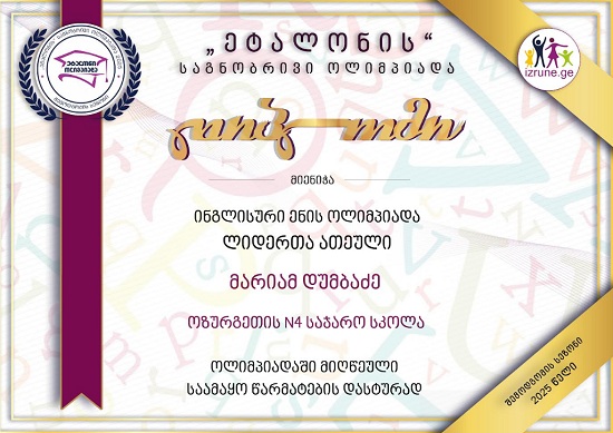 მარიამ დუმბაძე, ინგლისური ენის ოლიმპიადის, შესაბამისი კლასის, გამარჯვებულთა ათეულში მოხვდა.