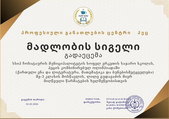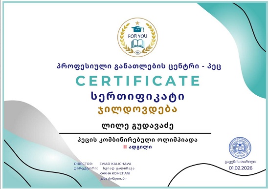 პროფესიული განათლების ცენტრის კომბინირებული ოლიმპიადის ფინალურ ტურში III კლასის მოსწავლე ლილე გუდავაძემ II ადგილი მოიპოვა და დაჯილდოვდა სერტიფიკატით.