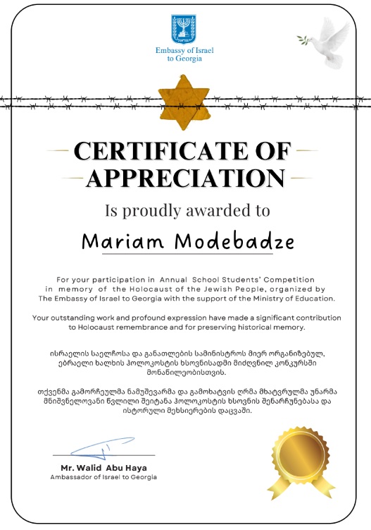 სკოლამ ისრაელის საელჩოსგან მადლობის წერილიც მიიღო.