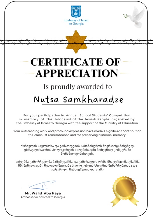 „ძვირფასო კონკურსის მონაწილე, ძვირფასო მასწავლებლებო და სკოლის ადმინისტრაციის წარმომადგენლებო, ისრაელის საელჩოს სახელით გვსურს გულწრფელი მადლობა გადაგიხადოთ ჰოლოკოსტის ხსოვნისადმი მიძღვნილ ყოველწლიურ სასკოლო კონკურსში მონაწილეობისთვის.