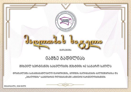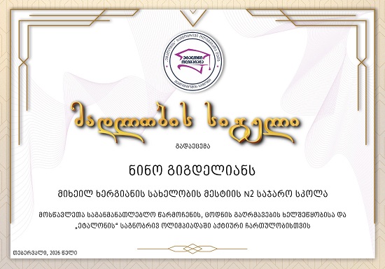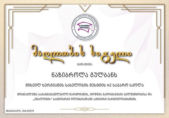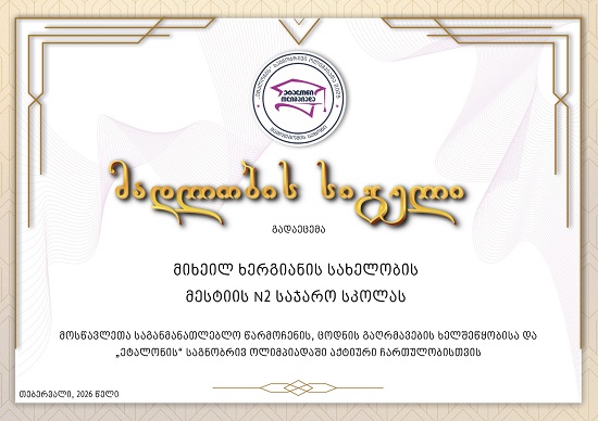 მოსწავლეთა ცოდნისა და განვითარების ხელშეწყობისთვის დაბა მესტიის N2 საჯარო სკოლამ „ეტალონისგან“ მადლობის სიგელი მიიღო.