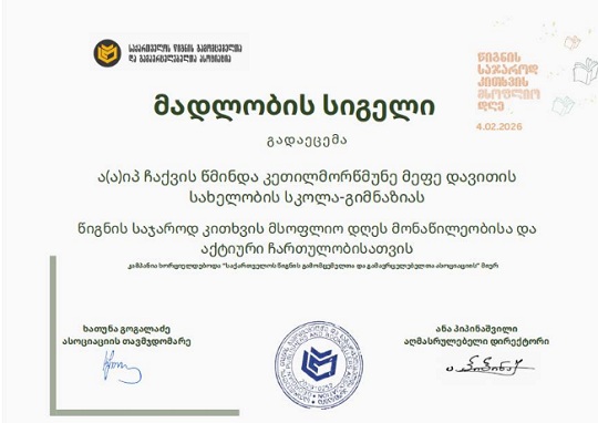 გიმნაზიას მადლობის სიგელი გადაეცა წიგნის საჯაროდ კითხვის მსოფლიო დღეს მონაწილეობისა და აქტიური ჩართულობისათვის.