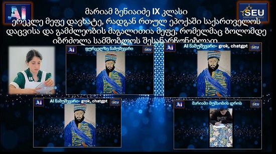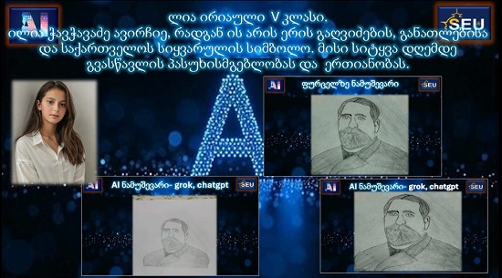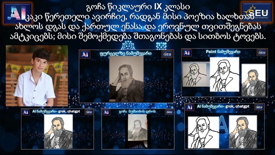 პედაგოგმა ეკატერინე ჩიტაურმა პროფესიონალურად წარმართა მოსწავლეთა მომზადება, ხელი შეუწყო იდეების განვითარებას, თითოეული ნამუშევრის დახვეწასა და ხარისხიან შესრულებას. მოსწავლეებმა შექმნეს ორიგინალური AI-ნამუშევრები, განავითარეს კრიტიკული აზროვნება, ციფრული კომპეტენციები და საჯარო წარდგენის კულტურა.