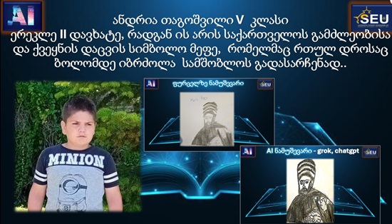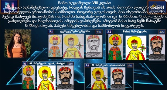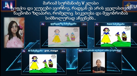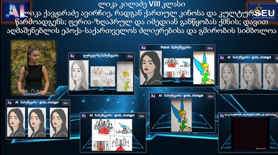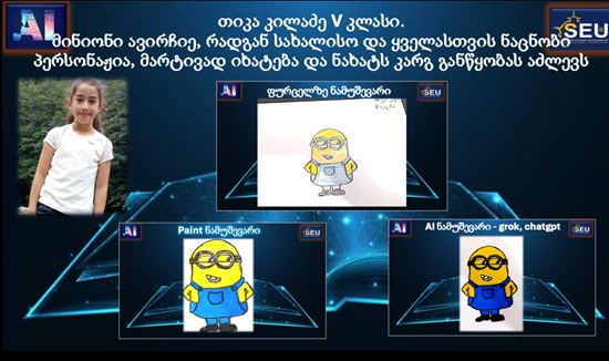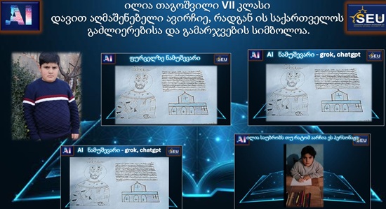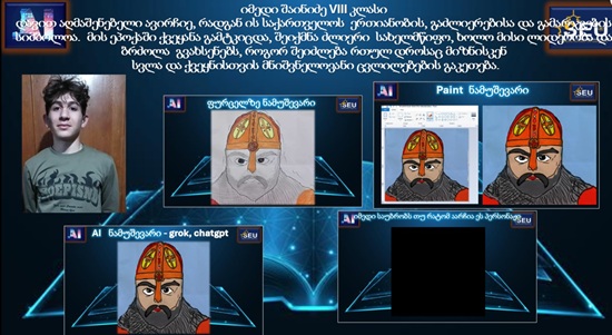 ეკატერინე ჩიტაურმა პროფესიონალურად წარმართა მოსწავლეთა მომზადების პროცესი, ხელი შეუწყო იდეების განვითარებასა და თითოეული ნამუშევრის ხარისხიან შესრულებას. მოსწავლეებმა შექმნეს ორიგინალური AI ნამუშევრები, განავითარეს კრიტიკული აზროვნება, ციფრული კომპეტენციები და პრეზენტაციის კულტურა.