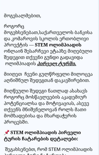 „მადლობა მონაწილე მოსწავლეებს: პავლე კაკოშვილს, გიორგი თიბილაშვილის, ანა ტუღუშს, ნიკა ღვინიაშვილს და მარიამ ხუტუაშვილს. გისურვებთ წარმატებებს მეორე ტურშიც.