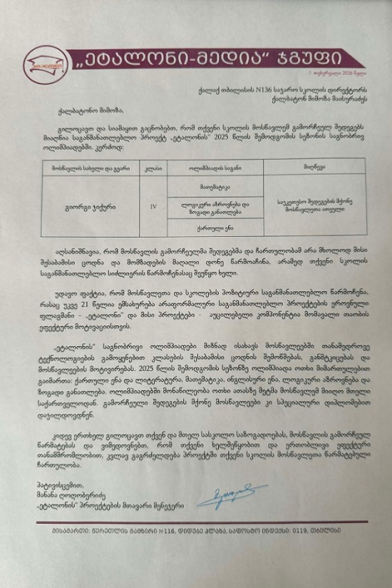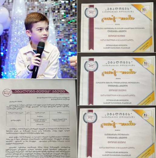 აღსანიშნავია, რომ სკოლამ მოსწავლის წარმატების შესახებ „ეტალონისგან“ ოფიციალური წერილიც მიიღო.