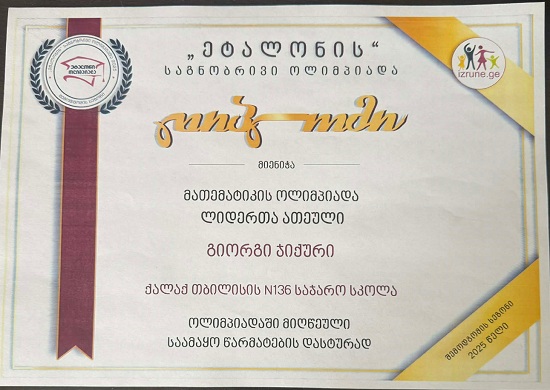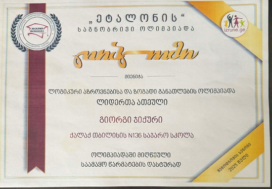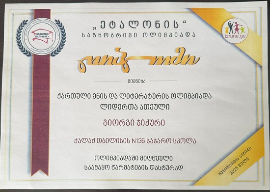 თბილისის N136 საჯარო სკოლაში მოსწავლის - გიორგი ჯიქურის საამაყო წარმატებით ამაყობენ.