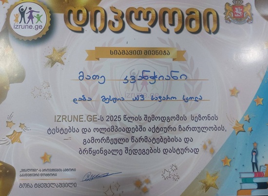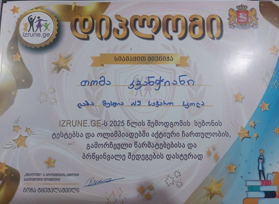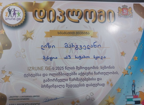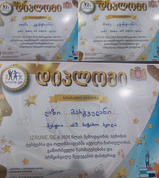 ახლახან, მოსწავლეები izrune.ge-ს 2025 წლის შემოდგომის სეზონის ტესტებსა და ოლიმპიადებში აქტიური ჩართულობის, გამორჩეული წარმატებებისა და ბრწყინვალე შედეგების დასტურად დიპლომებით დაჯილდოვდნენ.