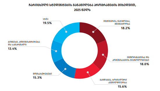 2025 წელს სტუდენტთა 18,8% ინჟინერია, წარმოება შენებლობის პროგრამაზე ჩაირიცხა, 18% ინფორმაციისა და კომუნიკაციების ტექნოლოგიებზე, 15.6% ჯანდაცვა, სოციალური კეთილდღეობის ორიგრამებზე, 15.3% მომსაურებოების მიმართულებით, 13.4% ბიზნესი, ადმინისტრირება და სამართალის საგანმანათლებლო პროგრამაზე ხოლო 19.5% სხვა პროგრამებზე.