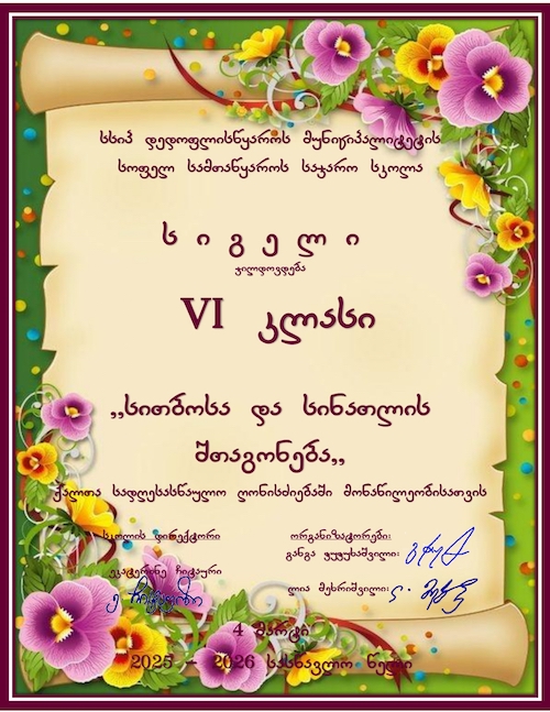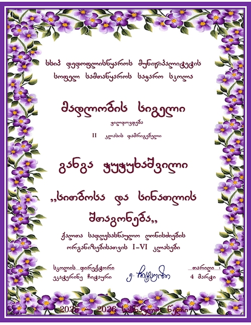 ღონისძიების დასასრულს სკოლის დირექტორმა ეკატერინე ჩიტაურმა ორგანიზატორებს გადასცა მადლობის სიგელები, ხოლო მონაწილე კლასებს სიგელები აქტიური ჩართულობისა და შემოქმედებითი მუშაობისთვის.