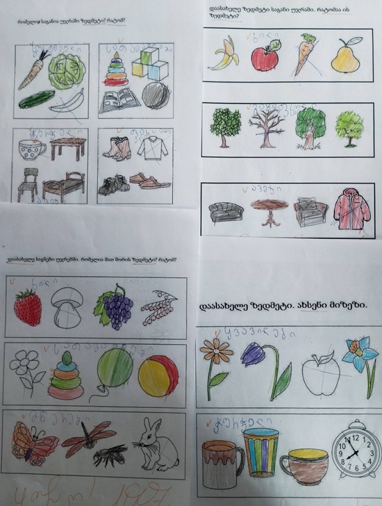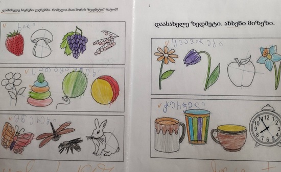 დავალების მიზანია: საგნების კლასიფიკაცია საერთო ნიშნების მიხედვით (მაგ: ხილი, ბოსტნეული, წელიწადის დროები), განივითაროს წვრილი მოტორიკა გაფერადების გზით და შეძლოს საკუთარი ნამუშევრის წარდგენა (თხრობის უნარის განვითარება)“,- წერს პედაგოგი.