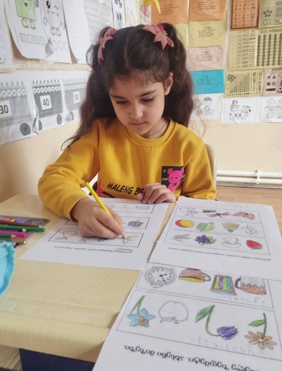 ჩემი პირველკლასელი ბაბი - მოსწავლეც და მასწავლებელიც - ხალისით ასრულებს ვიზუალურ სავარჯიშოებს (საგნების დაჯგუფება, გაფერადება, ლოგიკური წყვილები).