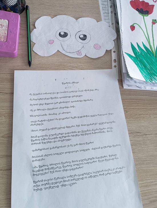 ბავშვებმა ი.სიხარულიძის ლექსი - „ვისი ხარ, წყაროვ, ვისი“ შეისწავლეს და გაეცნენ დამატებით ტექსტს ნ.კუპრავას - წყაროს ამბავს“. მოსწავლეებმა ასევე ნახეს სასწავლო ვიდეორესურსი წყლის - წყაროს წყლის სიკეთის შესახებ.