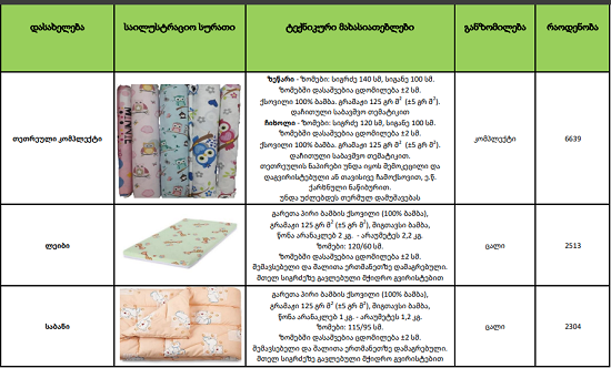 საგენტოს სურს შეისყიდოს: 6639 ცალი თეთრეული კომპლექტი; 2513 ცალი ლეიბი; 2304 ცალი საბანი; 4354 ცალი ლოგინის გადასაფარებელი; 127 ცალი სამზარეულოს უნიფორმა (შარვალი, პიჯაკი, ქუდი); 345 ცალი ხალათი ექთნის; 1361 ცალი წინსაფარი; 1608 ცალი წინსაფარი მრეცხავების; 1509 ცალი წინსაფარი ორმაგი (გადასაცმელი); 1169 ცალი პატარა ტატამი; 9806 ცალი დასაჯდომი ბალიში. თემატური
