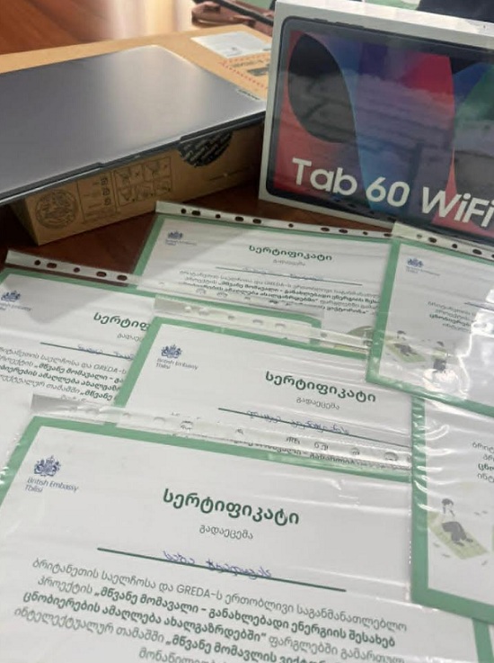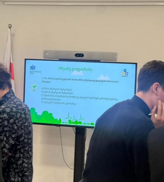 30 მარტს, ბრიტანეთის საელჩოსა და ორგანიზაცია GREDA-ს (საქართველოს განახლებადი ენერგიის განვითარების ასოციაცია) ინიციატივით, ქალაქ თბილისში ჩატარდა ერთობლივი საგანმანათლებლო პროექტის - „მწვანე მომავალი- განახლებადი ენერგიის შესახებ ცნობიერების ამაღლება ახალგაზრდებში“- დასკვნითი ინტელექტუალური თამაში - „მწვანე მომავლის ვიქტორინა“.