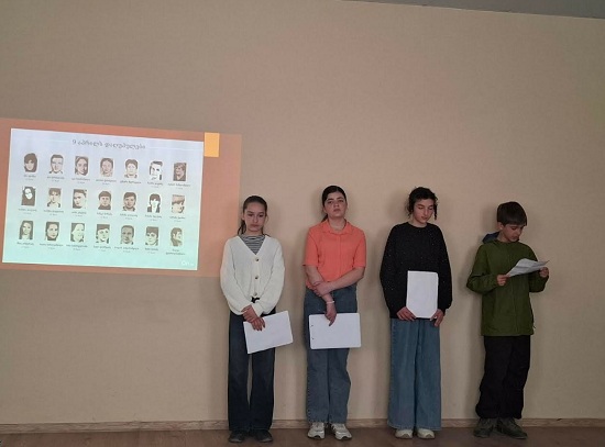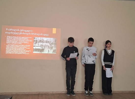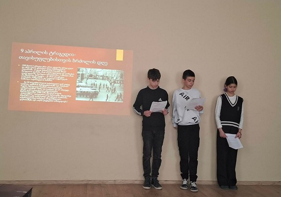 მოსწავლეები სიტყვით გამოვიდნენ, გაიხსენეს 9 აპრილის ტრაგედია- 1989 წლის 9 აპრილს, თბილისში მომხდარი მოვლენები, რაც გამოიხატა საბჭოთა არმიის მიერ ანტისაბჭოთა, საქართველოს დამოუკიდებლობის მოთხოვნით მოწყობილი მშვიდობიანი დემონსტრაციის ძალისმიერ დარბევაში, რის შედეგადაც დაიღუპა 21 და დაშავდა 427 ადამიანი.