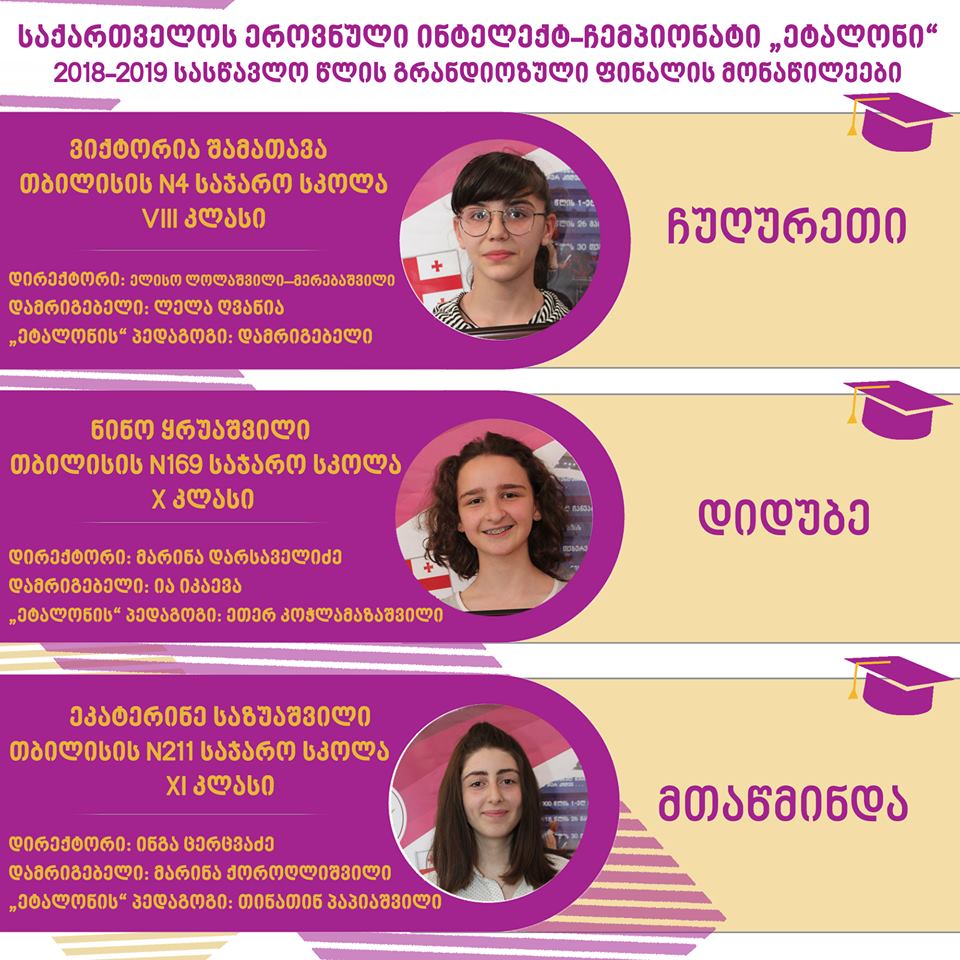 საქართველოს ეროვნული ინტელექტ-ჩემპიონატ„ეტალონის“ 2018-2019 სასწავლო წლის ფინალი დღეს 12 საათზე განათლების, მეცნიერების, კულტურისა და სპორტის სამინისტროს დარბაზში გაიმართება. მანამდე კი გაგაცნობთ „ეტალონის“ ფინალისტებს მთელი საქართველოდან.