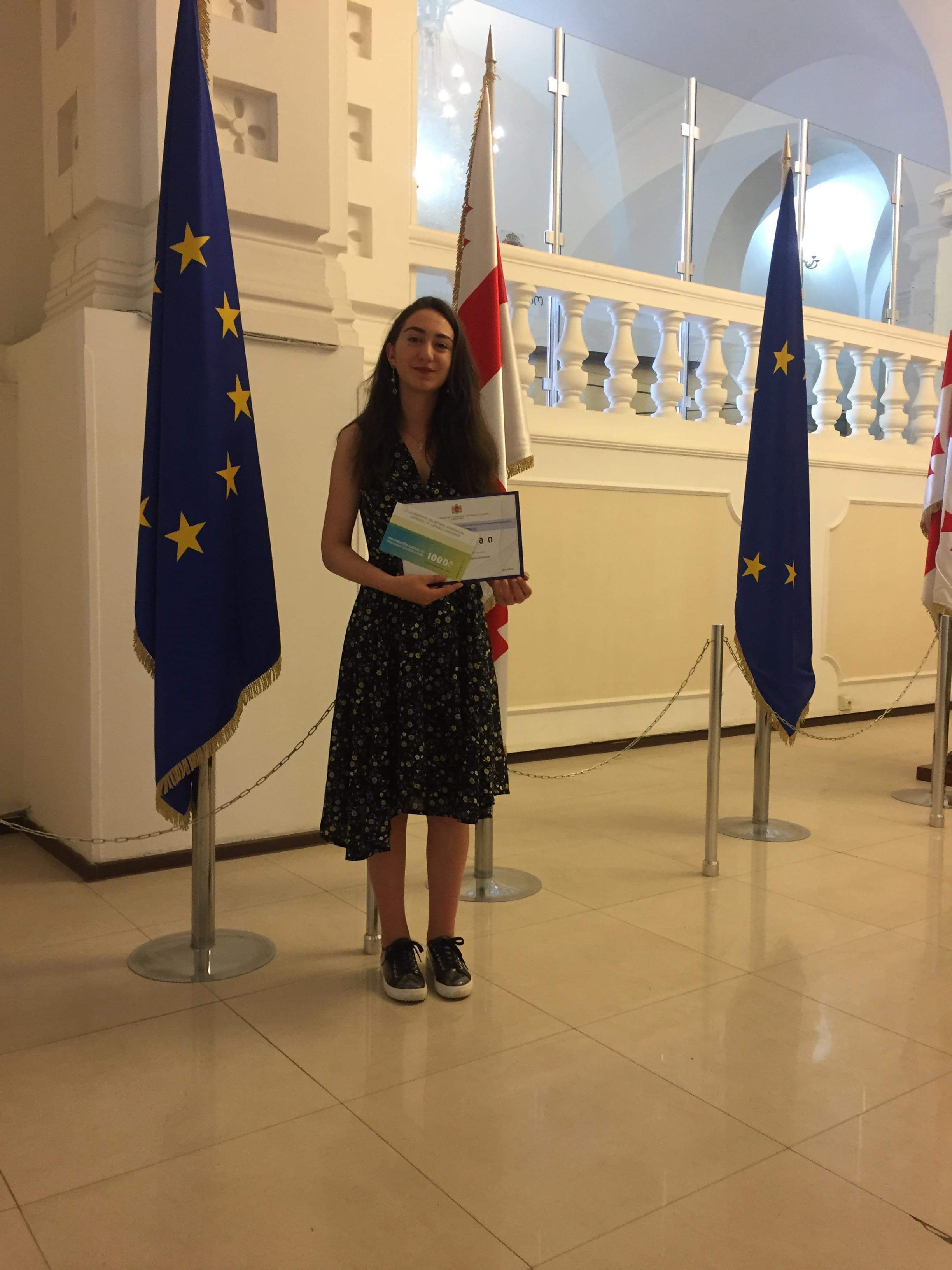 ღების საჯარო სკოლის მოსწავლეს ანი ლობჯანიძეს გადაეცა 1000 ლარიანი ვაუჩერი, რომლის გამოყენებაც შეუძლია კომპიუტერიული ტექნიკის მაღაზიაში ნივთის შესაძენად, ის ასევე გაემგზავრება სტრასბურგში.