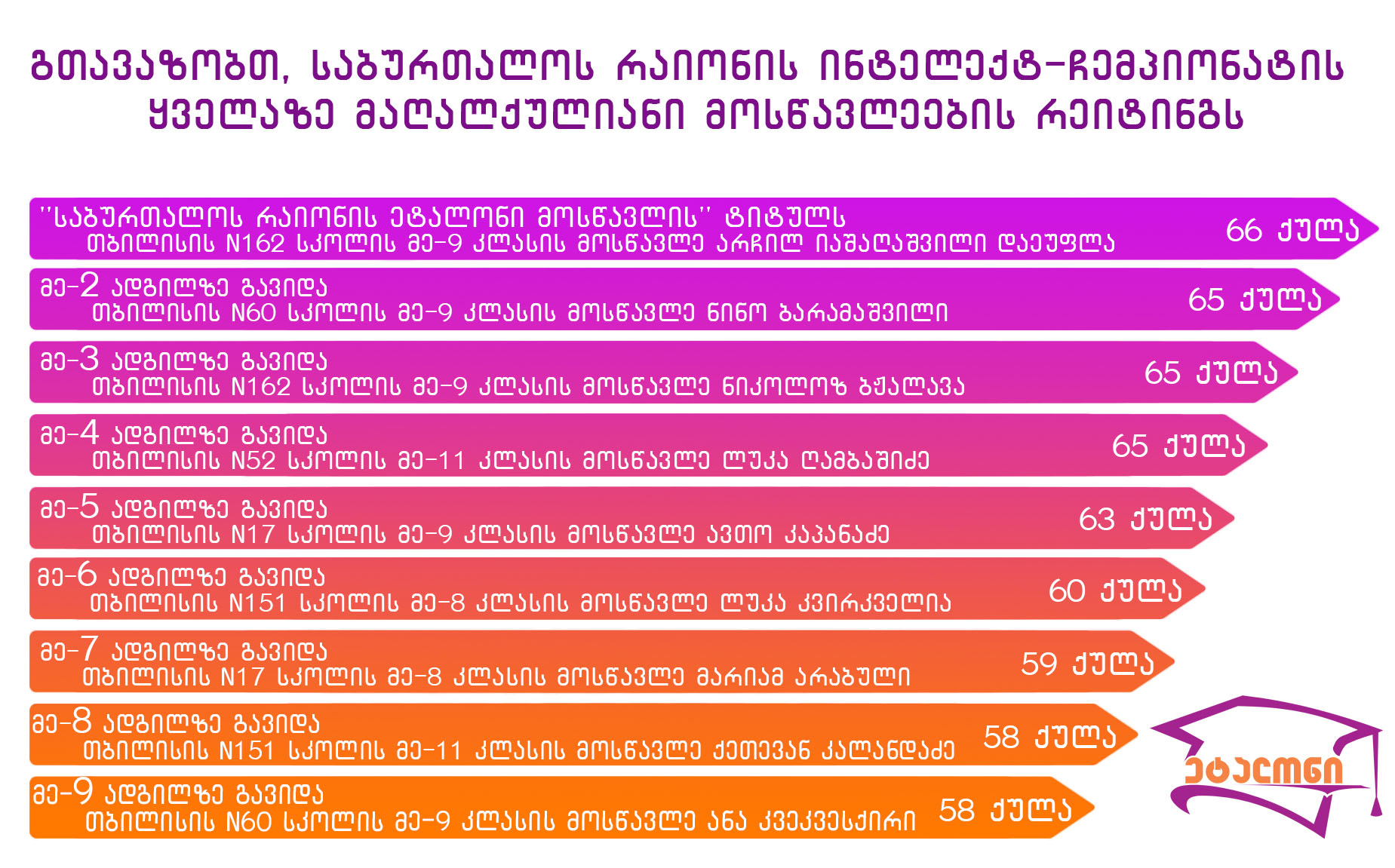 გთავაზობთ, საბურთალოს რაიონის ინტელექტ-ჩემპიონატის ყველაზე მაღალქულიანი მოსწავლეების რეიტინგს.