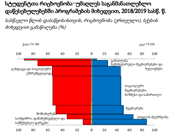 „საქსტატის“ ცნობით, უმაღლეს საგანმანათლებლო დაწესებულებებში პროგრამების მიხედვით, 2018-2019 სასწავლო წელს როგორც ქალი სტუდენტების, ასევე კაცი სტუდენტების ყველაზე დიდი რაოდენობა 3 მიმართულებით იყო. ესენია: სოციალური მეცნიერებები, ბიზნესი და სამართალი.