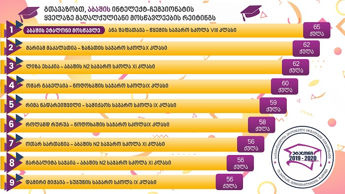 გთავაზობთ აბაშის ინტელექტ-ჩემპიონატის ყველაზე მაღალქულიანი მოსწავლეების რეიტინგს.