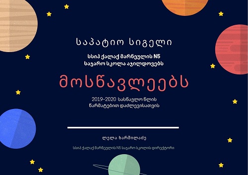 სსიპ ქალაქ მარნეულის N5 საჯარო სკოლა გილოცავთ 2019-2020 სასწავლო წლის დასრულებას, გისურვებთ ბედნიერ არდადეგებს, ჯანმრთელობას და ბევრ სიხარულს. ძალიან დიდი მადლობა მშობლებს სკოლასთან თანამშრომლობისთვის და მხარდაჭერისთვის“,-წერია სკოლის ინფორმაციაში.
