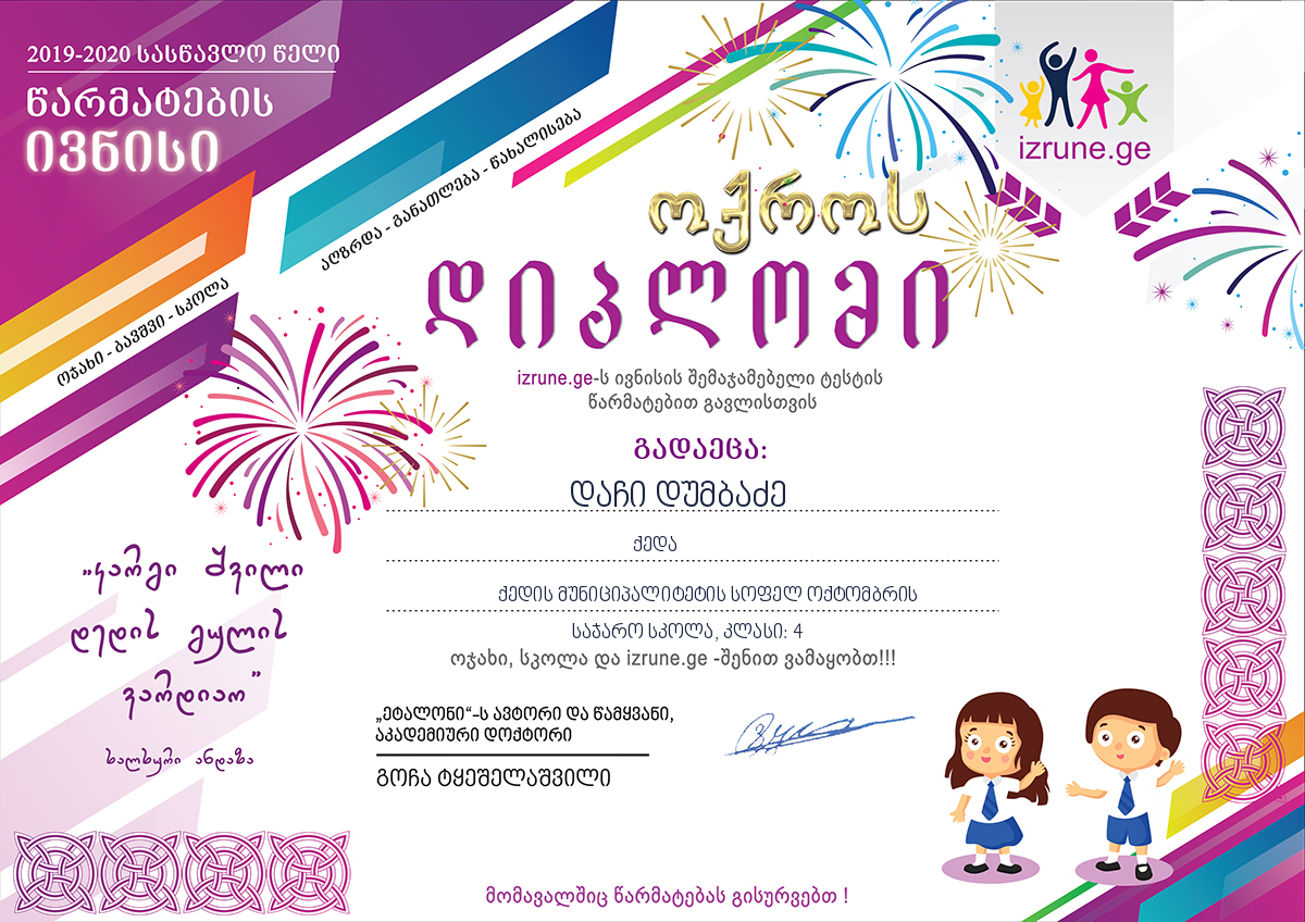 ივნისის შემაჯამებელი ტესტი მოსწავლეებმა: ანამარია ჩხიკვაძემ, მარიამ დუმბაძემ, ნიკა ზოიძემ, დაჩი დუმბაძემ, მარიამ ასამბაძემ და ანა კონცელიძემ წარმატებით გაიარეს და ოქროს დიპლომები მოიპოვეს.